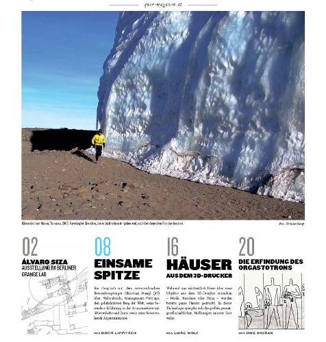 Da geht’s um konkrete Architektur mit innovativem Potential wie die futuristische Berghütte der Genfer Architekten Groupe H am Mont Blanc, das Berliner Stacked House der irischen Architektin Michelle Howard oder die Bauten der Werkgruppe Graz aus den Jahren 1959–1989. Aber auch Architektur aus dem 3-D Drucker oder Zukunftsszenarien aus Sahara und Stadtplanung werden zum Thema gemacht. Das und vieles mehr im neuen …