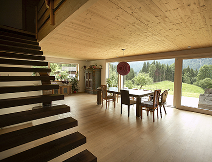 Der Architekt fand eine Lösung für die Verbindung von Alt und Neu. Die äußere Form wurde beibehalten, gleichzeitig nutzte er aber den Spielraum der Bauvorschriften und konnte so auf die Wünsche der Bauherren eingehen. Die verzichteten dank großzügiger Südterrasse auf den traditionellen Balkon – ‚Der macht nur Arbeit und wird wenig genutzt‘ – und wählten eine pflegeleichte Schindelfassade. Eine Entscheidung für die Nachhaltigkeit, die sich durchs ganze Haus zieht, wenn alte Träme und Bodendielen wiederverwertet werden. Neben dem Holz ist das Haus durch Licht und Offenheit geprägt. Drei unabhängige Wohneinheiten öffnen sich mit breiten Fensterfronten zur Bergkulisse, das frühere Kellergeschoß konnte dank Hanglage zur Ferienwohnung aufgewertet werden.