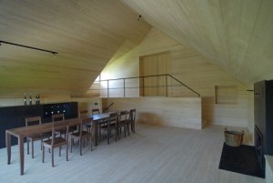 Anregung dafür fand Büchele bei einem Abnehmer seiner edlen Brände am Arlberg. Die Häuser des Hoteliers Gerold Schneider – Holzarchitektur in höchster Qualität – hatten es ihm angetan, und so war der Weg zum Architekten Phillip Lutz nicht weit. ‚Verwurzelt, bodenständig, qualitätsorientiert‘ so lautet die Eigendefinition von Albert Büchele, die auch auf das neue Wirtschaftsgebäude passt. Und so kommen auch wieder die Bäume ins Spiel. Ausgeführt in traditioneller Holzkonstruktion mit Satteldach fügt sich das langgestreckte Gebäude harmonisch in die dörfliche Umgebung ein. Nur der Kopfbereich ist massiv errichtet, um den technischen Anforderungen der Schnapsbrennerei gerecht zu werden. Das Holz aus den hofeigenen Wäldern hat aber nicht nur tragende Funktionen sondern ziert sägerau oder samtigfein auch Böden, Wände und Fassaden.