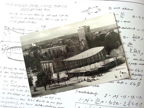 Vor dem Faksilile der statischen Berechnung für das Hängedach von Ulrich Finsterwalder, 1953