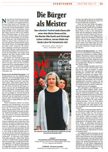 ‘Das beste Forum für den Aufbau einer demokratischeren Gesellschaft sind die Stadtviertel. Dort kann man die eigene Handlungsmacht erfahren. Städte sind ein ausgezeichnetes Labor für Demokratie.’ Elke Rauth im Interview mit Maik Novotny, der in der Wiener Stadtzeitung FALTER dem diesjährigen Festival für urbane Erkundungen einen bestens recherchierten Artikel widmete. THNX!