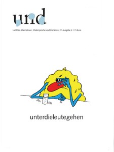 Die vierte Ausgabe des UND ist da. Ein weiteres Heft für Alternativen, Widersprüche und Konkretes. Thema? unterdieleutegehen – So kannst du doch nicht unter die Leute gehen! Grantig, mit ungebügeltem Gesicht oder zerknitterter Sonntagshose. Oder noch schlimmer: wütend, mit verhülltem Gesicht und ohne Hose? Was darf man? Was ist gesellschaftsfähig und wer bestimmt das? Was ist Gesellschaft und wozu brauchen wir sie?