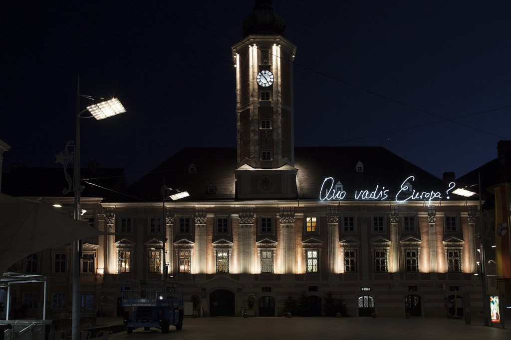 Outdoor-Gallery für Nachtschwärmer und Herbstspazierer. Sieben großmaßstäbliche Installationen im öffentlichen Raum laden ab sofort zwischen St. Pöltener Stadtzentrum und Regierungsviertel zum Kunstwandeln in Sachen Europa.