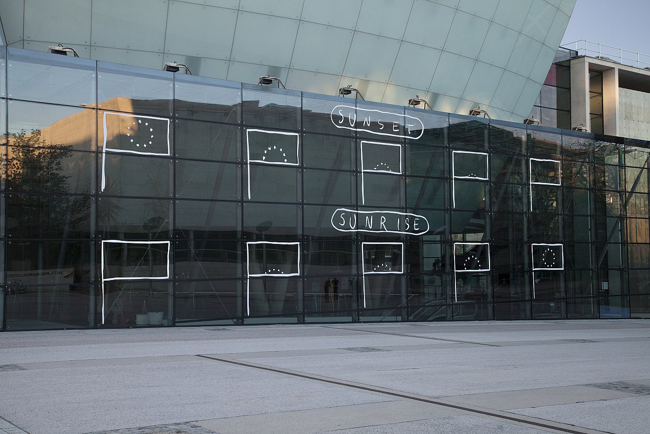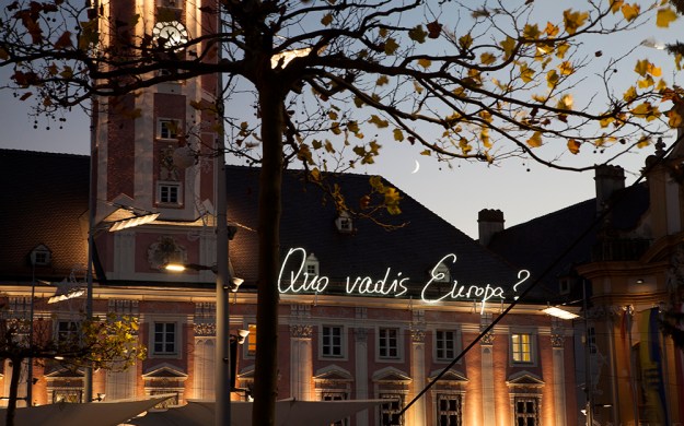 Outdoor-Gallery für Nachtschwärmer und Herbstspazierer. Sieben großmaßstäbliche Installationen im öffentlichen Raum laden ab sofort zwischen St. Pöltener Stadtzentrum und Regierungsviertel zum Kunstwandeln in Sachen Europa.