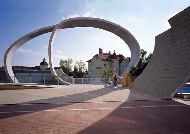 Das Entree zum Campus der Donau-Uni haben Peanutz -Architekten mit dem ca. 15 Meter hohen “Loop” als Landmark gestaltet und zugleich einen Vorplatz mit Aufenthaltsqualität geschaffen. Zum Niederlassen laden auch die 21 in Boden und Rasen eingelassenen Mosaike von Iris Andraschek und Hubert Lobnig ein, die von fernöstlichen und asiatischen Teppichen inspiriert sind und auch auf die aus dem angelsächsichen Raum stammenden Debattier-Kultur des Campus verweisen.