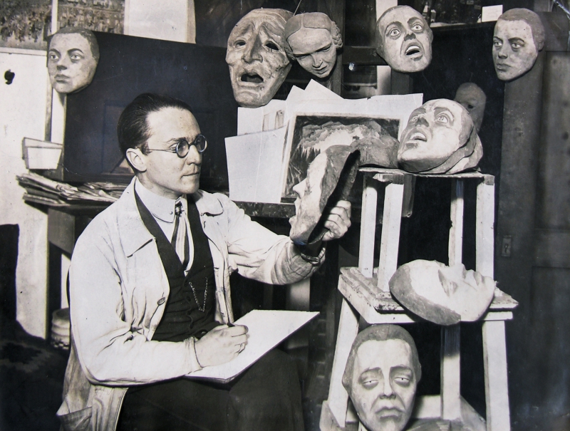 FOTOATELIER A. FRANKL, BERLINEmil Pirchan mit Masken im Berliner Atelier, 1923Fotografie, 11,9 × 16,5 cmSammlung Steffan/Pabst, ZürichFoto: Sammlung Steffan/Pabst, Zürich© Nachlass Emil Pirchan, Sammlung Steffan/Pabst, Zürich