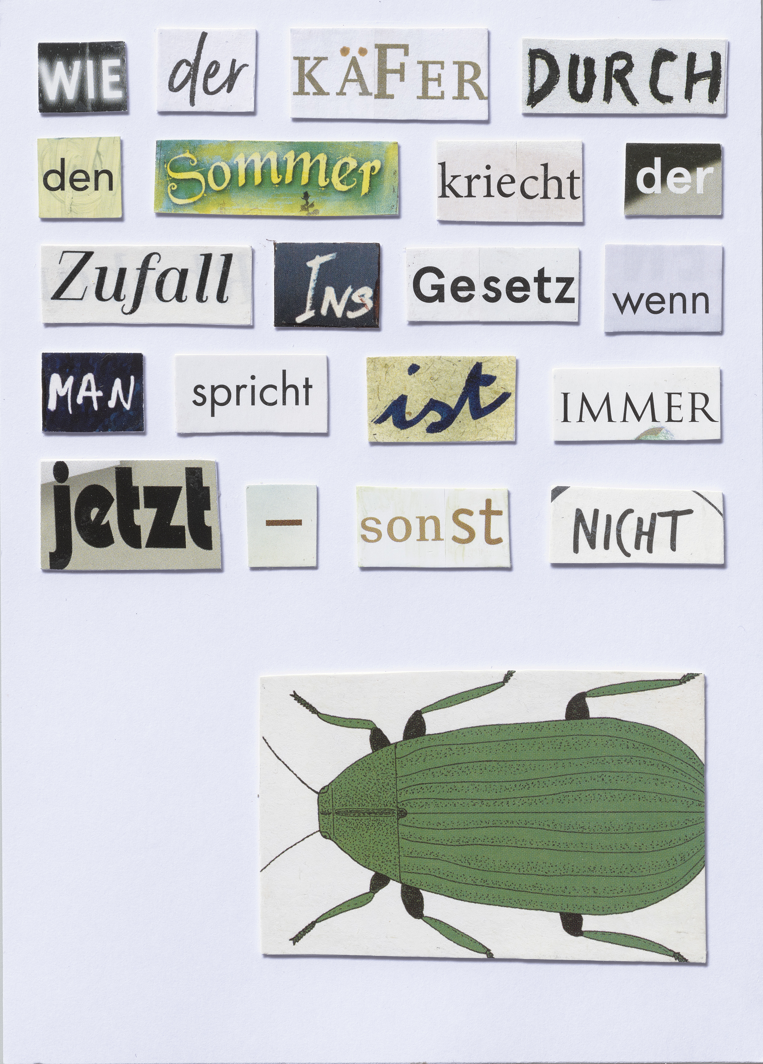 Seit über dreißig Jahren widmet sich Müller der künstlerischen Praxis poetischer Collagen, die sie aus Zeitungs- und Magazinausschnitten sowie Bildern arrangiert. Die ersten Collagen entstanden 1989 als Postkarten, die sie auf Reisen an Freunde und Bekannte verschickte. Die Künstlerin entwickelte seither den Prozess des Collagierens kontinuierlich weiter und ist ihrem Papierformat treu geblieben. Sie lässt sich von gefundenen Worten leiten und verbindet ihre einzigartige Sprache mit der jeweiligen Typografie wie auch mit Papierfärbungen und -mustern. Je nach Länge und Inhalt dauert die Arbeit an den Collagen mehrere Tage oder auch Wochen.