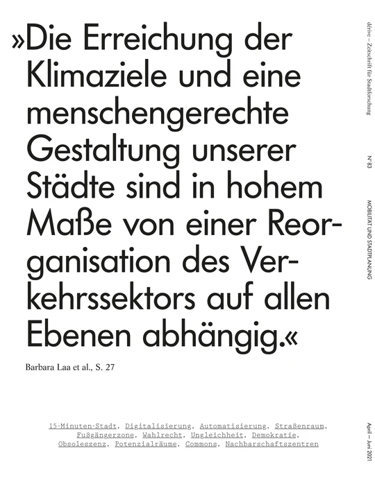 Im Schwerpunkt Mobilität und Stadtplanung, der 83. Ausgabe von dérive, blicken wir nach vorne und zurück; sehen uns die Geschichte der Fußgängerzonen ebenso an wie die möglichen räumlichen Konsequenzen automatisierten Fahrens. Dazu bietet der Schwerpunkt eine Analyse des 15-Minuten-Stadt-Konzepts und zeigt strukturelle Barrieren der Mobilitätswende sowie mögliche Lösungen auf. Im Magazinteil geht es um die Demokratiearmut in urbanen Gesellschaften und um die Obsoleszenz baulicher Strukturen, im Diskussionsbeitrag um in Wien neu entstehende sozio-kulturelle Zentren.