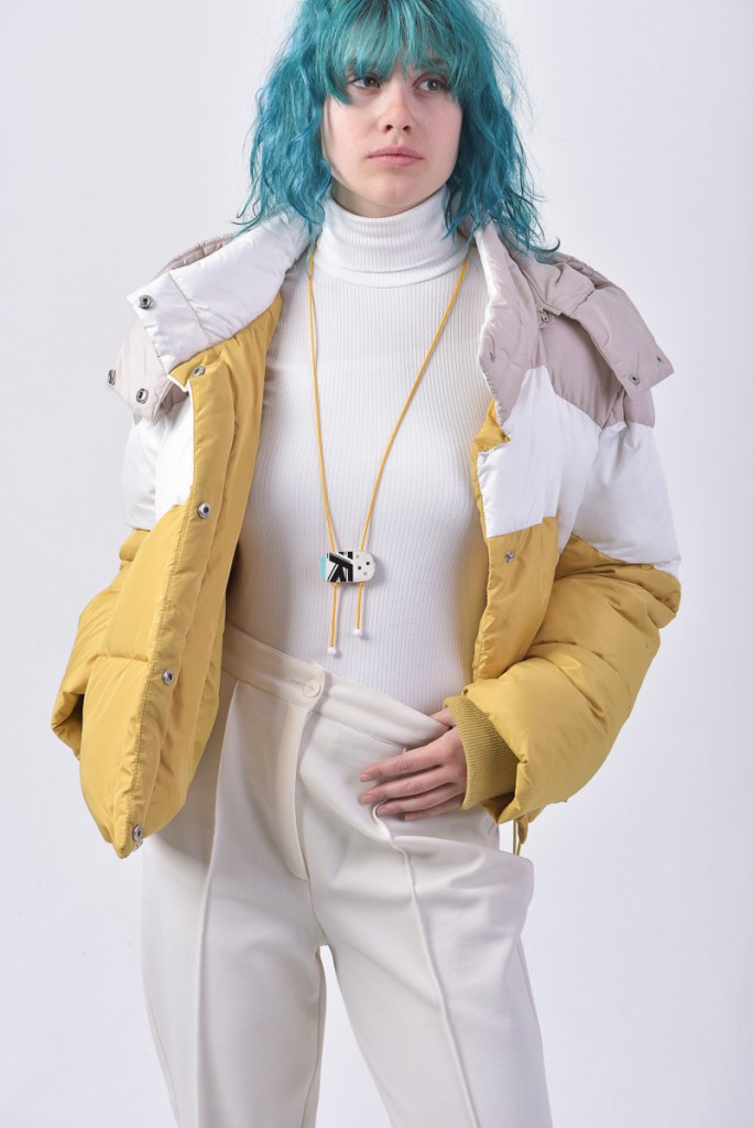 Zur aktuellen Kollektion aus den Serien der objet trouvés hat sie ein Dachbodenfund inspiriert. Ein paar alte Langlauf-Skier und Skistöcke, in die sie sich “verliebte”. Dieser coup de foudre trifft sie bei künstlichen wie natürlichen Fundstücken gleichermaßen. Waren es früher schon bunte Wasserschläuche, Comics-Schnipsel oder Unterwäschezubehör in herrlichen Vintage-Farben, die sie in ihren Stücken verarbeitete, so haben zuletzt auch Naturmaterialien wie Obstkerne oder Kieselsteine ihre Wege gekreuzt.