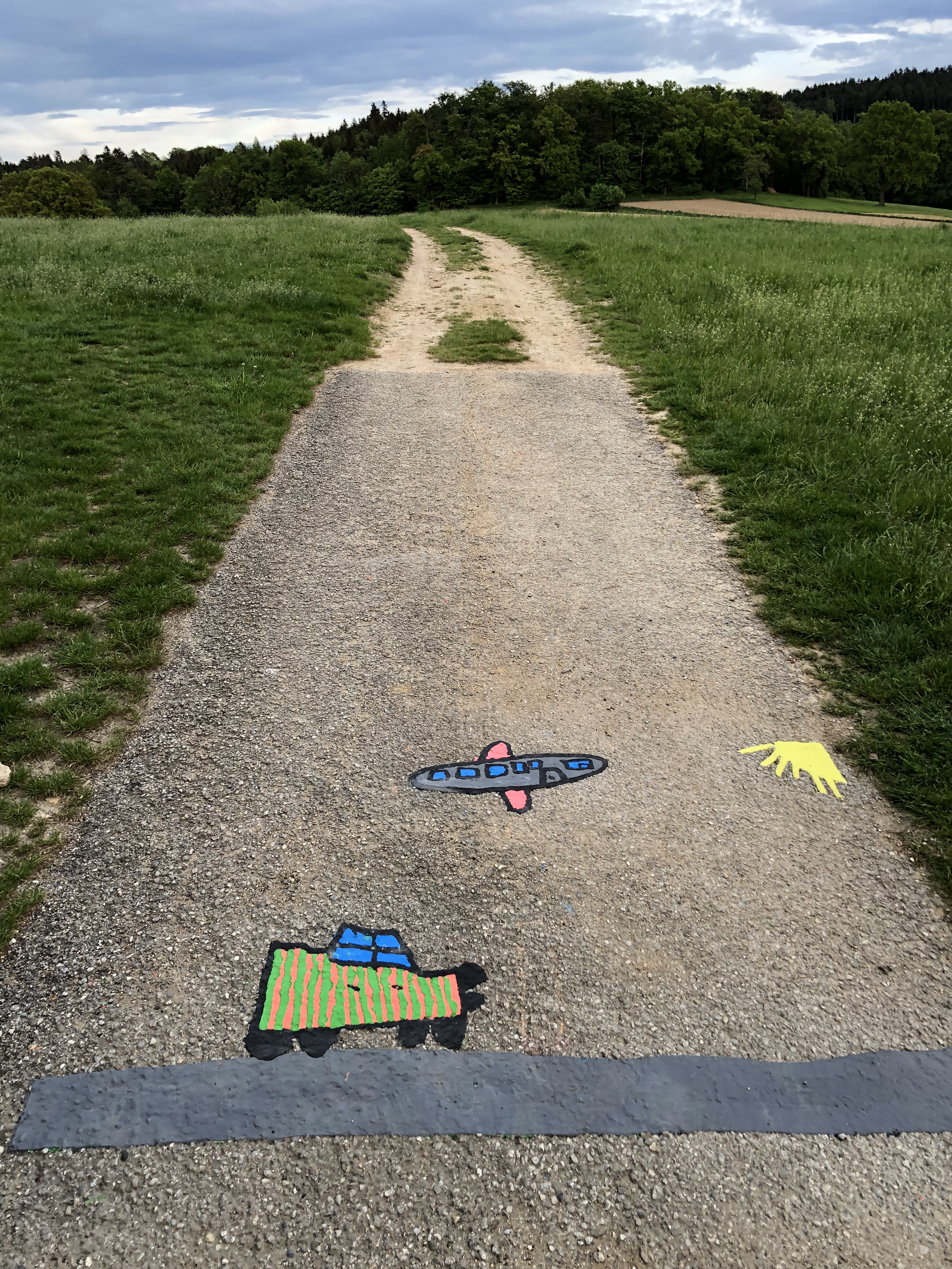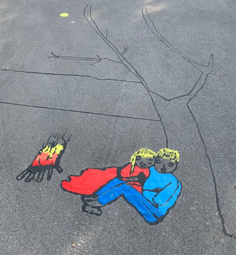 Hierfür besuchte sie letztes Jahr ein Flüchtlingslager auf Lesbos. Sie wollte herausfinden, welche Vorstellungen die dort lebenden Kinder und Jugendlichen von Sicherheit und Geborgenheit haben. Die im Rahmen von Workshops entstandenen eindrücklichen Zeichnungen und Malereien sind nun im Museum ERLAUF ERINNERT zu sehen. Einige wurden von Bolt als permanente Bodenarbeiten in den öffentlichen Raum von Erlauf übertragen und ermöglichen so die unvermittelte Kommunikation von den die Kinder im ‚dazwischen‘ zu den Menschen im Frieden.