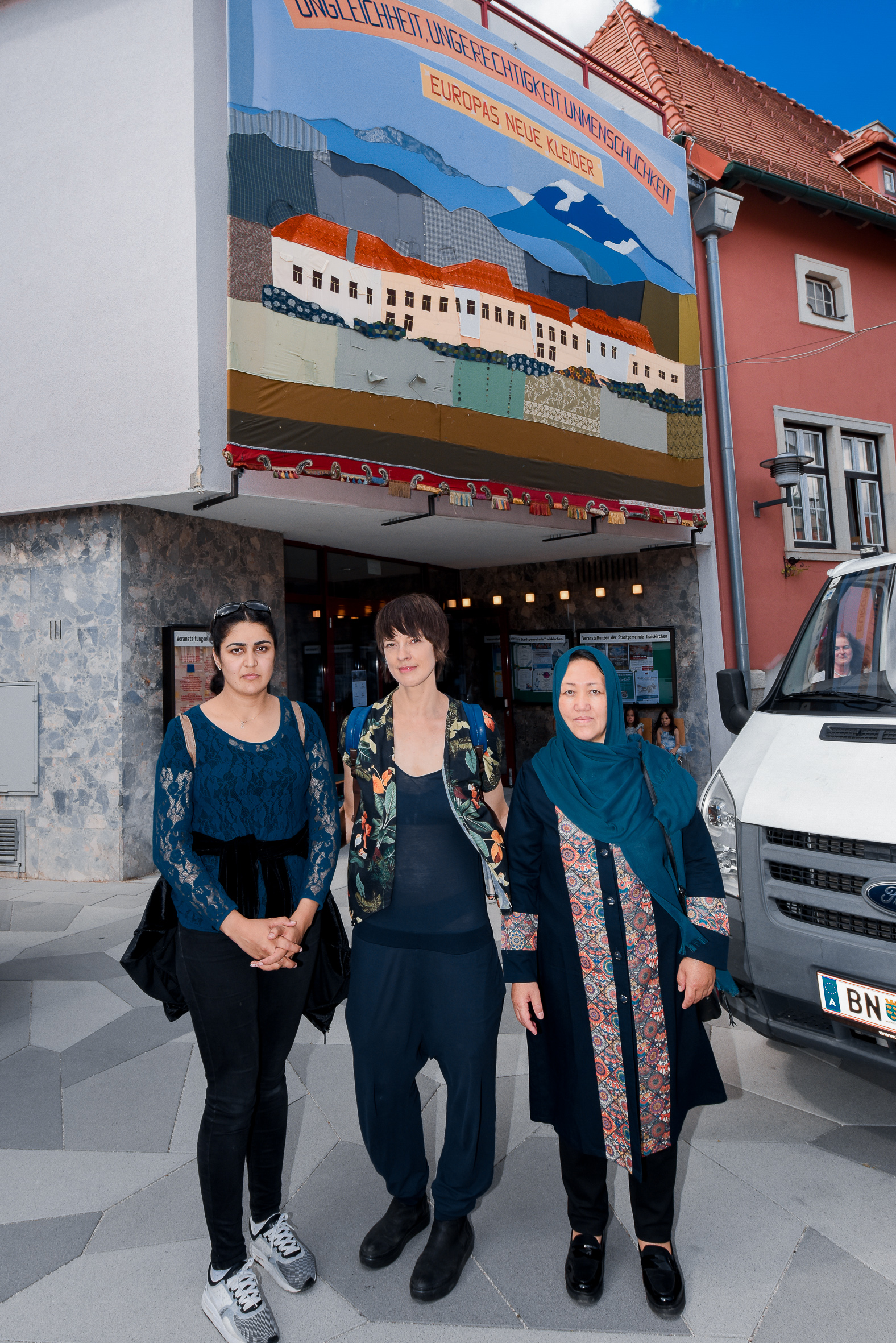 In Zusammenarbeit mit vier geflüchteten Schneiderinnen wurde aus gespendeten Kleidungsstücken ein großflächiges textiles Bild produziert. Zusätzlich begleiteten Juristinnen, die auf Arbeitsrecht und auf die Anerkennung ausländischer Berufsqualifikationen spezialisiert sind, das Projekt, um juristische Auslegungsmethoden und Anerkennungsmöglichkeiten zu erarbeiten. So wie Kleidung manchmal geändert werden muss, damit sie zu einem anderen oder einem sich verändernden Körper passt, ist auch das geltende Rechtssystem kein statischer, sondern ein flexibler Komplex, der regelmäßigen