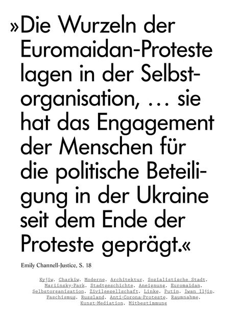 Sie bringt bringt architektur- und stadthistorische Beiträge über Kyjiw und Charkiw sowie über die Rolle, die Selbstorganisation seit dem Euromaidan in der ukrainischen Gesellschaft spielt. Timothy Snyder gewährt Einblick in die Gedankenwelt des 1954 verstorbenen faschistischen russischen Philosophen Iwan Iljin, den Wladimir Putin verehrt und gerne zitiert. Rechte Raumnahme durch die Organisator*innen von Coronademos am Beispiel der sächsischen Stadt Freiberg und ein Interview mit der Kunstinitiative Neue Auftraggeber sind weitere Themen dieser Ausgabe. Das Kunstinsert stammt diesmal von Oliver Ressler.