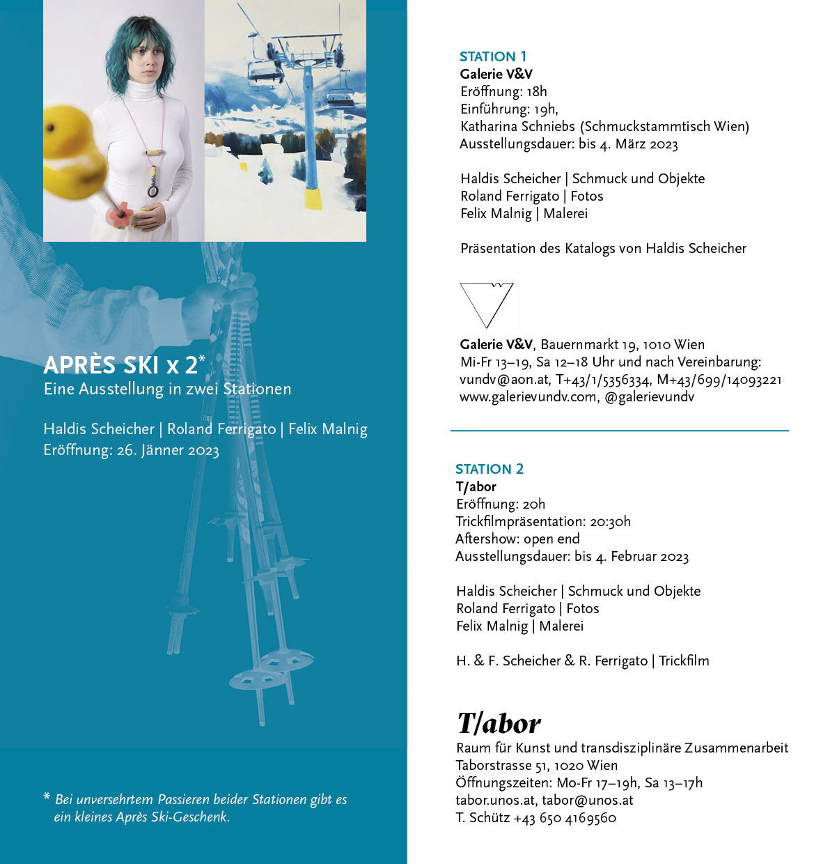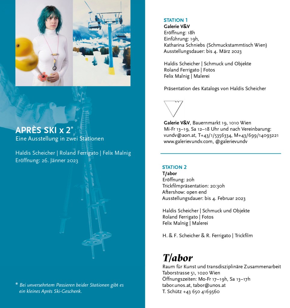 APRÈS SKI schon vor dem Schnee. Die bereits in Südtirol erfolgreiche Ausstellung kommt nach Wien und eröffnet eine urbane Skischaukel der Extraklasse. Die Arbeiten von Haldis Scheicher treten in Dialog mit der Malerei von Felix Malnig, großformatige Fotos von Roland Ferrigato zeigen ihre Objekte in irritierenden Inszenierungen. Auf sehr unterschiedliche Weise haben sich die drei KünstlerInnen dem gemeinsamen Thema Wintersport angenähert.