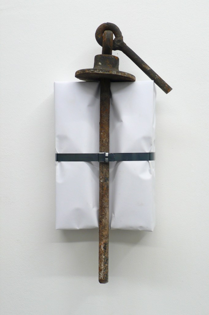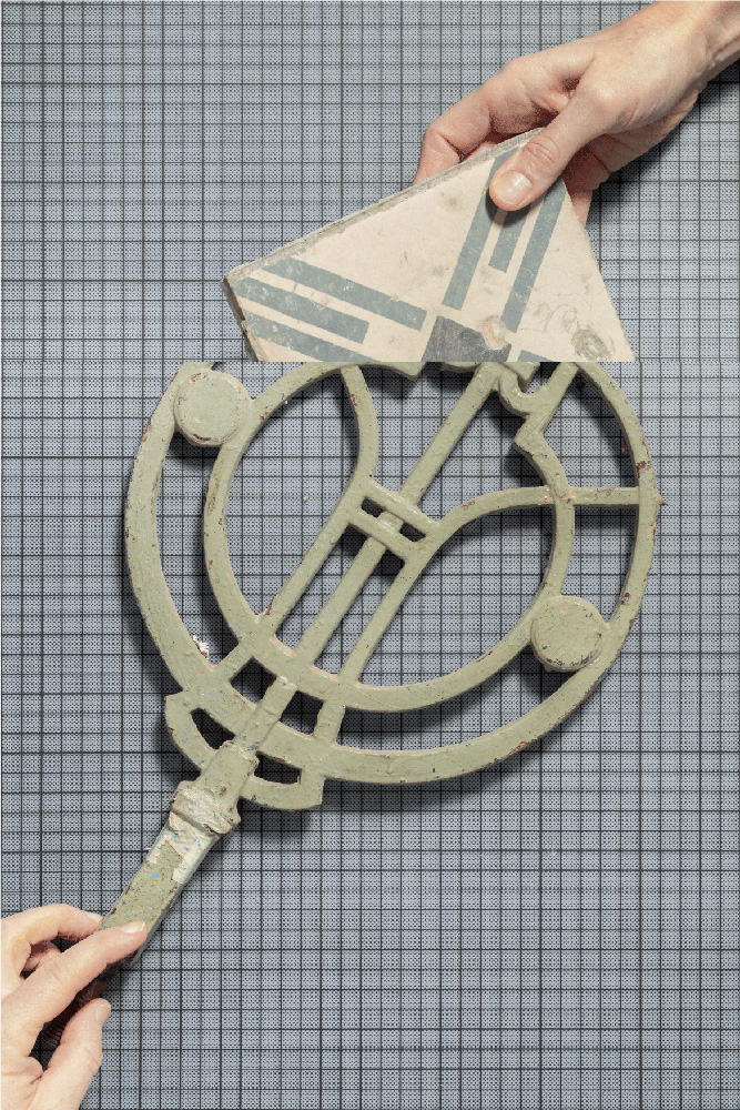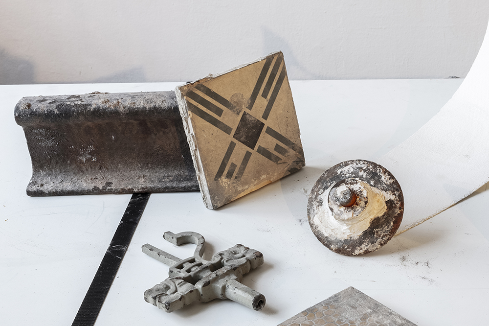 Materialien und architektonischen Oberflächen, die während der Sanierung auf der Baustelle im WUK gesammelt wurden, fügt Fogarasi zu ungewöhnlichen Compilations zusammen, um so ein abstrahiertes Porträt des Ortes zu erstellen, das nun im Rahmen der Wiedereröffnungs-Ausstellung ‘Täterätää! KEX macht auf. zu sehen ist.