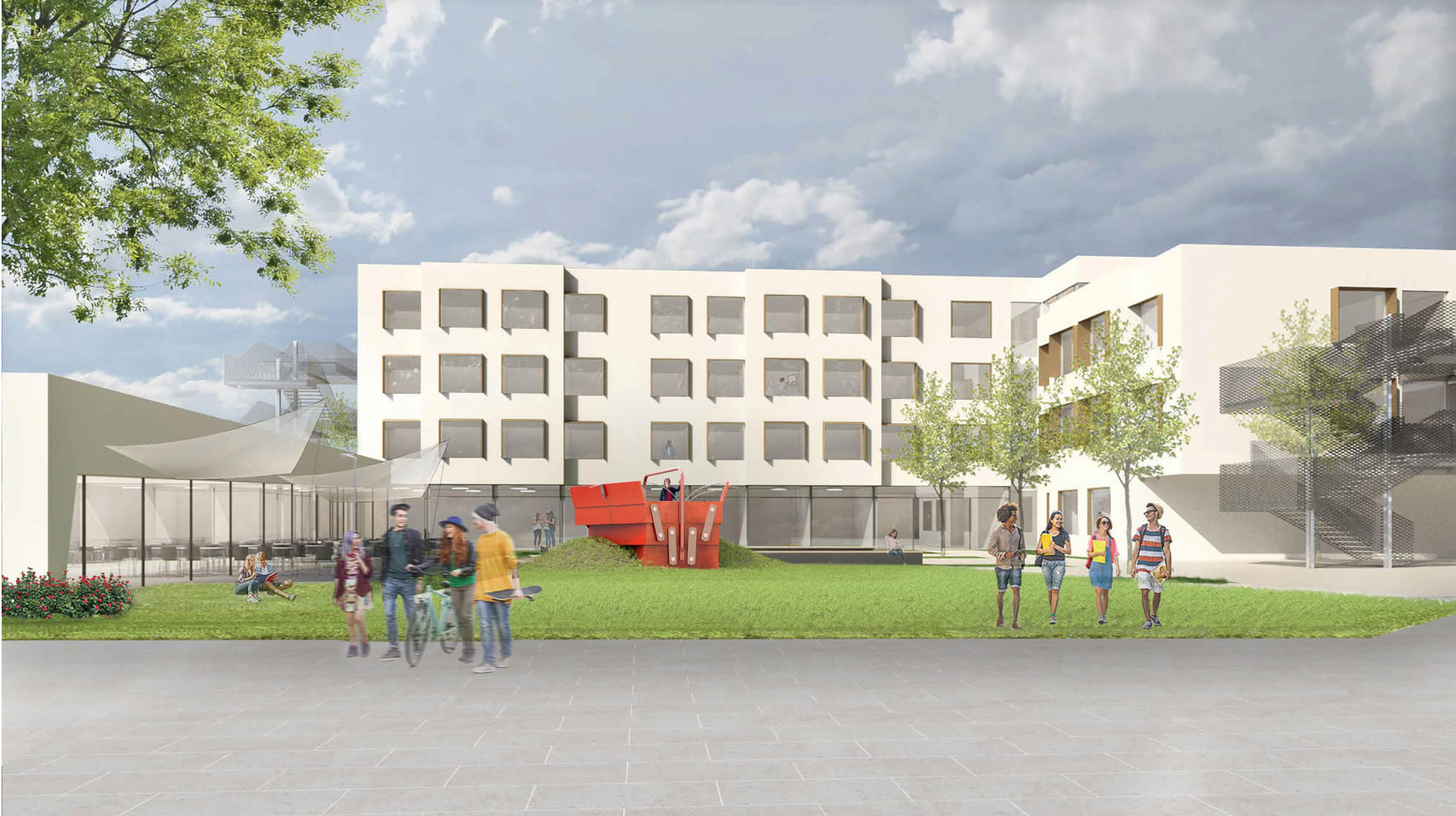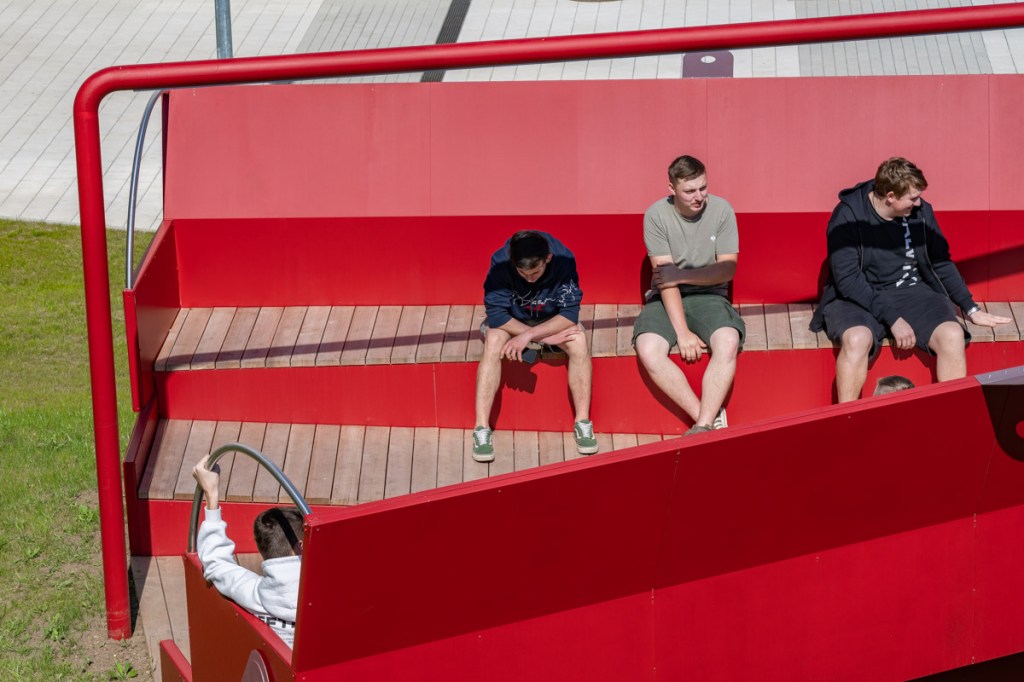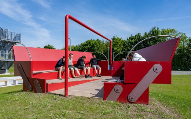 Signalwirkung und Anziehungskraft vereint die begehbare Skulptur, die Anna Vasof für die Berufsschüler:innen in Mistelbach geschaffen hat. Gleich einem überdimensionalen Werkzeugkasten lockt das signalrote Kunstwerk die technikaffinen Jugendlichen mit großzügigen Sitzgelegenheiten ins Freie und entwickelt zugleich eine große identitätsstiftende Kraft für die Institution.