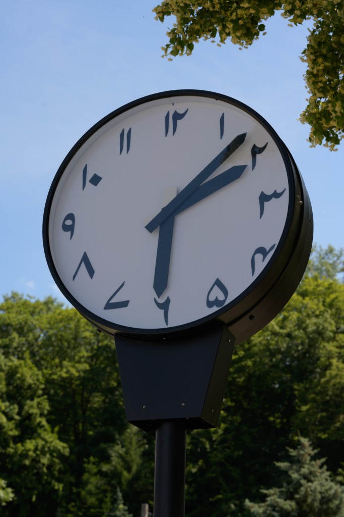 Am Fuße der Schallaburg rückt neuerdings eine ganz besondere Uhr die gewohnte Perspektive in weitere Dimensionen. Die ‘Gleichzeituhr’ von Natalie Deewan ist Teil eines Kunstparcours, der das Thema der Jubiläumsausstellung – nach 50 Jahren wird die Renaissance neu in den Fokus gerückt – auch in den Außenraum trägt, und hier im speziellen den ‘westlichen’ Standpunkt mit ost-arabischem Zifferblatt in Frage stellt.
