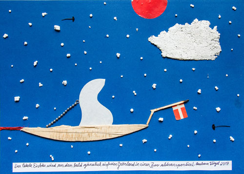 Vorausgesetzt man hat den richtigen Humor dazu und liebt es, durch zufällige Anstöße seinen Phantasiekaskaden freien Lauf zu lassen. Dann werden aus Zigarettenpackungen schnittige Abfahrtsläufer:innen, aus Blaupause verschleierte Afghaninnen oder aus einem Abriss Weißpapier ein ausgehungerter Eisbär im klimaerwärmten Grönland-Meer…
