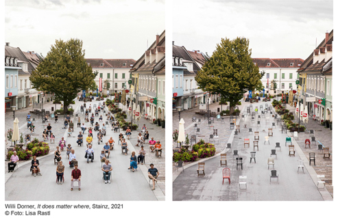 Der zweite Akt im Rahmen der alljährlich stattfindenden Friedenstage am 10. Mai bringt einen weiteren Aspekt der Versöhnung ein: das wortwörtliche ‘Zusammensetzen’. Die Bevölkerung ist eingeladen, auf der – für dieses Ereignis eigens gesperrten – Straßenkreuzung einen großen Sesselkreis zu bilden und so auf Augenhöhe Austausch und Annäherung zu pflegen, (ein ähnlichs Projekt haben Dorner und Rastl bereis in Stainz realisiert), die fotografische Dokumentation des Perfomance wird dann dauerhaft im Museum ERLAUF ERINNERT zu sehen sein.