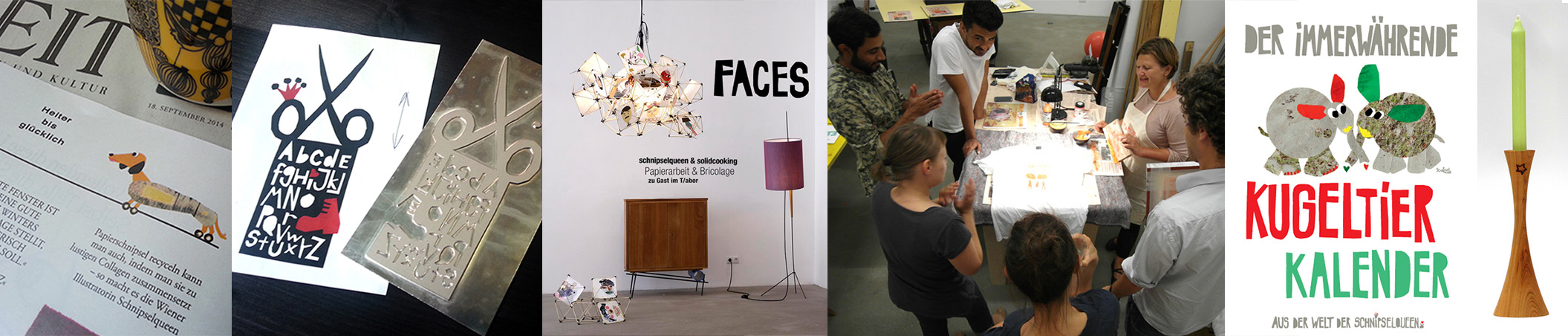 -Recycling der etwas anderen Art betreibt die schnipselqueen, die vormehmlich in Papier-Collagen macht, dabei aber gerne über den Tellerrand schaut und künstlerische Kollaborationen eingeht. Mit dem SCHUSTERJUNGEN hat sie individuelle Letterpress-Produkte entstehen lassen, mit der Schmuckkünstlerin HALDIS SCHEICHER nicht nur für das Projekt KIRSCHHIRSCH zusammengearbeitet. Mit dem Künstlerduo UNOS entstand eine interdisziplinäre Zusammenarbeit von Papierarbeit & Bricolage mit Ausstellung FACES, Workshop und Performance SOLID COOKING. Mit dem Architekten BERNHARD FRODL in der besten Tradition der Wiener Werkstätte mit einem Hauch der eleganten Fünfziger-Jahre das ABENDSTERN Produktdesign. Und immer wieder Team-Building und identitätstiftende Gemeinschaftsaktivität – CUT&PRINT-Workshops, Sommerkurse, Fortbildung individuell und für WIENXTRA , Institut für Freizeitpädagogik der Stadt Wien …