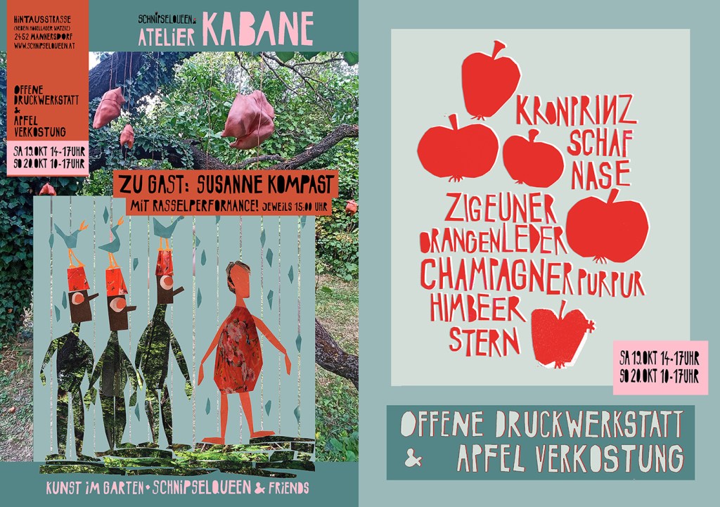 Im Rahmen der offenen Ateliers öffnet das Atelier KABANE erstmals seine Türen. Inmitten eines verborgenen Gartens entstehen in der Werkstatt der SCHNIPSELQUEEN phantasievolle Papiercollagen. Die kleine Holzkabane wird zum Ausstellungsraum, vom Garten rundum hat sich die befreundte Künstlerin SUSANNE KOMPAST inspirieren lassen und ihre Landart-Skulpturen in knorrigen Bäumen und geheimen Winkeln installiert. Diese werden im Rahmen der nachmittäglichen mit Rasselperformances aktiviert, die offene Druckwerkstatt lädt zum Selberdrucken ein: das passende Obstsackerl für die alten Apfelsorten, die zur Verkostung bereit stehen…
